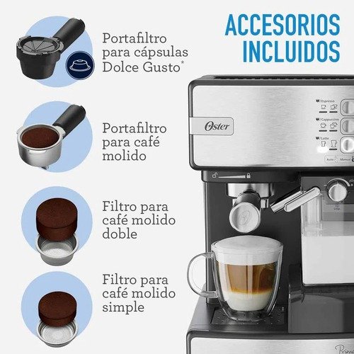 - Incluye porta filtro para café molido, 2 filtros para café molido sencillo y doble, porta filtro para cápsulas Dolce Gusto®, cuchara medidora con apisonador de café y manual de usuario con recetario de bebidas.