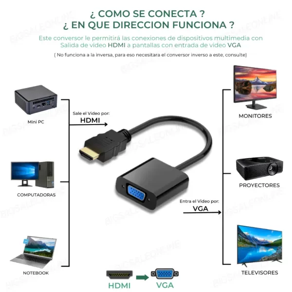 Hoy en día existen muchos los dispositivos con salida HDMI.. como por ejemplo, Notebook, PC de Escritorio, Blue-Ray, TV Box (Convertidores Smart) y muchos otros. Y al tener un Monitor/proyector o TV con entrada VGA no pueden conectarlo.. hasta la llegada de este espectacular Adaptador..!
